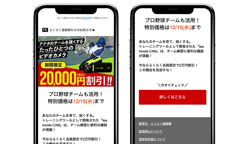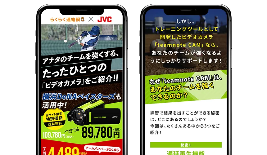 トレーニングツールとして活用できるスポーツ向けビデオカメラ「teamnote CAM」の訴求のため、スポーツチームなどの団体活動で多く利用される「らくらく連絡網」とのタイアップLPを作成。らくらく連絡網のTM、アプリバナーにて配信を行いました。