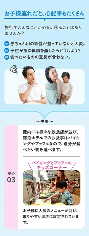 子連れでの来訪を後押しするプロモーションとして、ハワイアンズの中でもお子さまに優しいポイントを打ち出す施策をご検討されておりました。