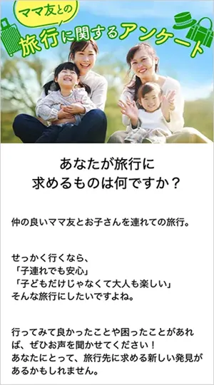 らくらく連絡網のママユーザーを対象に、「ママ友・お子さまとの旅行に関するアンケート」を実施し、旅行先での「あったらいいな」「これは困った」などの意見を募集しました。アンケート内ではフリー回答を用意してリアルな意見を収集したほか、宿泊先を選ぶ際の基準や、お子さまのプールデビューについての質問も盛り込みました。